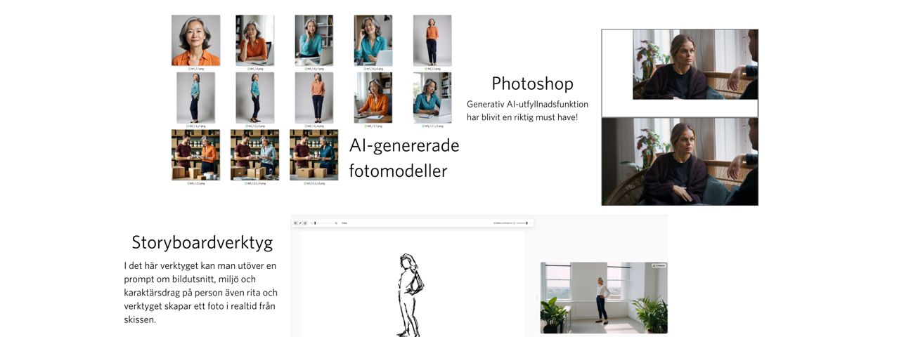 Vi använder bildgenerering där det tillför värde. Det kan vara för att visa ett förslag för en kund, skapa tydliga visuella underlag i ett tidigt skede eller ta fram variationer på ett tema. Ibland genererar vi helt nya bilder. Andra gånger modifierar vi befintligt material för att anpassa det till innehållet.