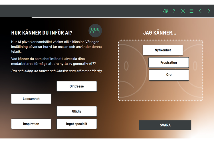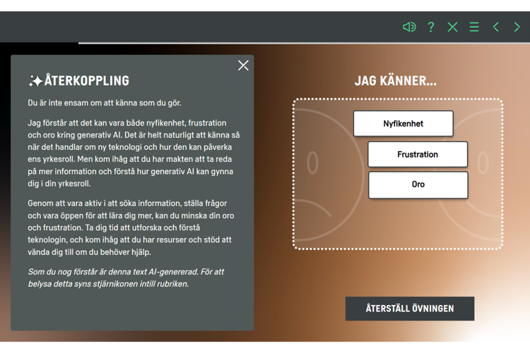 Vi använder generativ återkoppling i flera av våra utbildningar, bland annat för att stärka reflektion kring värderingar, skapa engagerande självskattningsövningar och göra onboarding mer personlig.